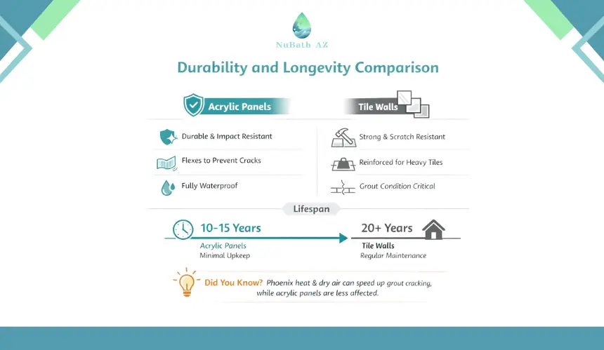 Tile is extremely durable and scratch-resistant, but grout lines can be affected by high heat and expansion. Acrylic panels handle slight temperature changes well and are less prone to cracking in Phoenix-area homes.