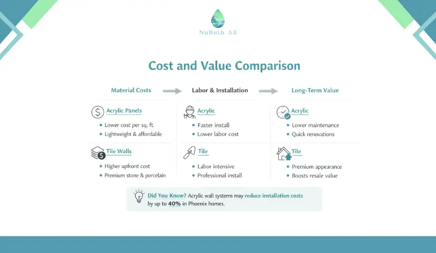Acrylic panels typically cost less upfront and reduce labor expenses due to easier installation. Tile may have higher material and labor costs, but it can add long-term value and aesthetic appeal, particularly in upscale neighborhoods like Paradise Valley.