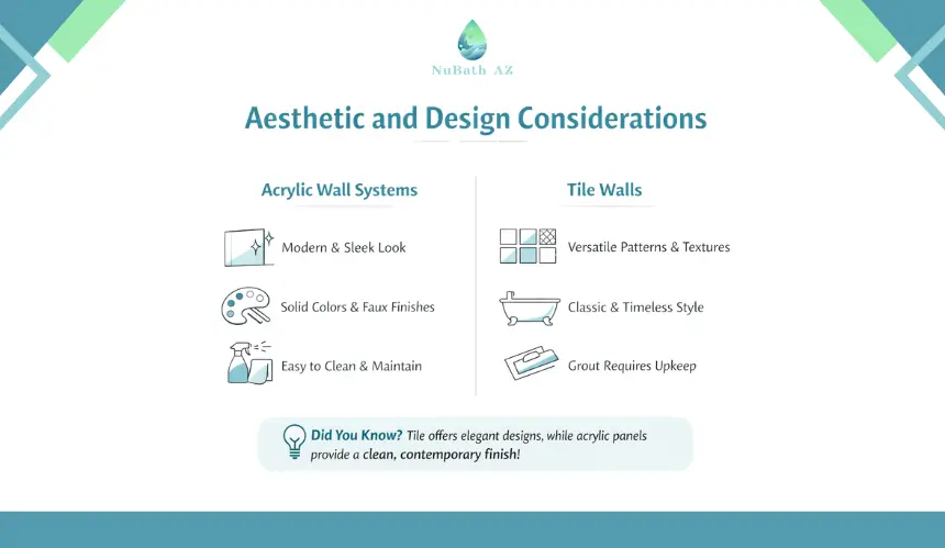 Choosing between acrylic wall systems and tile isn’t just about cost or durability; it’s also about the look and feel of your bathroom. Each option offers unique design possibilities that can influence the overall style, especially in Phoenix-area homes and surrounding neighborhoods like Scottsdale, Glendale, and Ahwatukee.