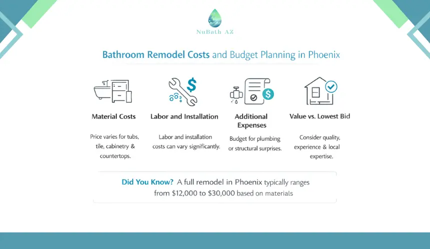 Costs vary by material, labor, and project scope. Standard remodels in Phoenix often range from $12,000 to $30,000, with premium finishes, custom cabinetry, or walk-in tubs increasing the budget.
